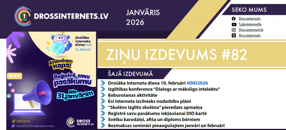 Ziņu izdevums veltīts Drošāka interneta dienai #DID2026, kas tiks atzīmēta š.g. 10. februārī, un tajā iekļauta informācija par aktivitātēm un izglītojošajiem materiāliem, kurus aicinām izmantot skolas, bibliotēkas, vecākus un ikvienu, izglītojot sava novada bērnus un jauniešus par drošību internetā visa februāra ietvaros. Atzīmēsim kopā!