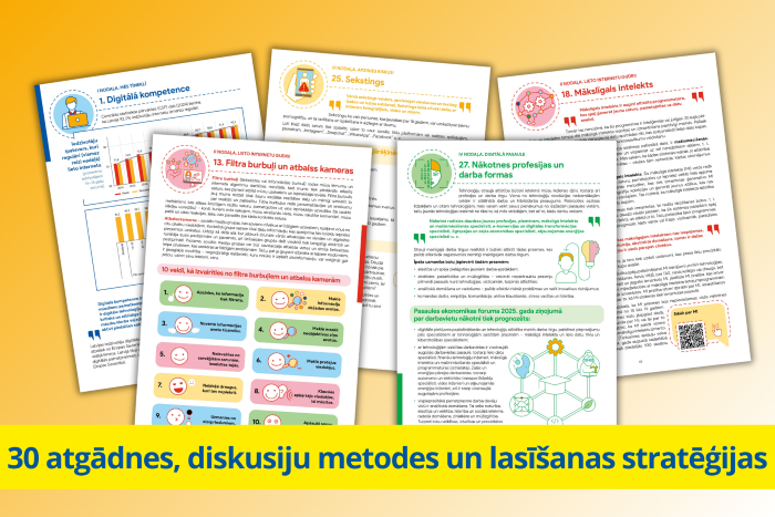 Rokasgrāmatā apkopotas 30 tēmas par tādām būtiskām jomām kā privātums, digitālā pēda, atbildība internetā, kritiskā domāšana, mākslīgais intelekts un digitālā labbūtība.